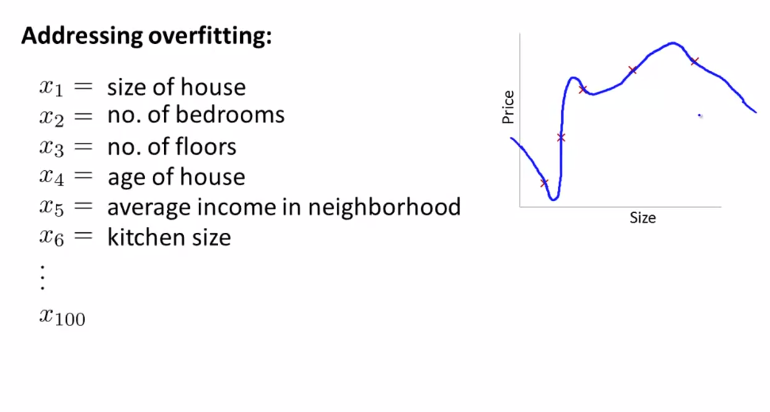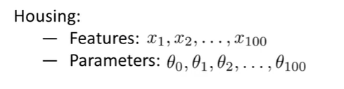 일단, 우리가 살펴본 예제는 전부 1차원 혹시 2차원의 예제였기 때문에 그냥 그래프를 그려서 직접 확인하면서 적당한 차원의 다항식을 선택하면 되었다. 그래서 Hypothesis Function 가설함수를 그래프로 표현하여 어떤 다항식을 사용하는지 보는 것이 한 가지 방법이 될 수 있다. 하지만 해당 방법은 항상 적용되지 않는다. 다항식의 차수가 높은 문제도 있지만, 엄청나게 많은 특성이 있는 경우에는 다항식의 차수를 선택할 선택지조차 주어지지 않는다. 또한, 특성이 많아질수록 그래프를 통해 시각적으로 표현하기도 어렵다. 예를 들어서 아래와 같은 경우가 있다.