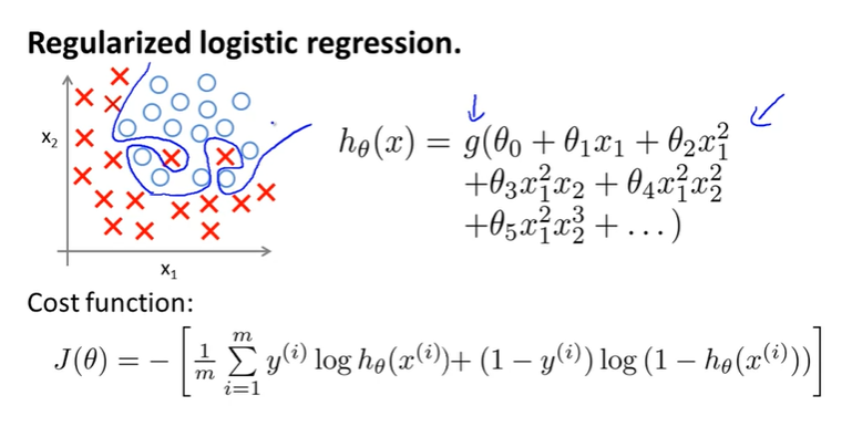 Logistic Regression에서의 Cost Function은 위와 같다. 우리는 이제 Reguralization을 한 비용함수를 고려할 것이고, Generalized된 Logistic Regression의 비용함수는 다음과 같다.