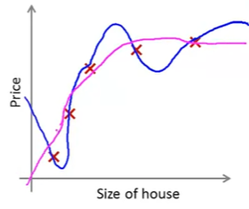 오른쪽 그래프와 같이 조금 극단적인 예제를 보면 4차 함수에 데이터를 맞추고 있고, 적어도 훈련용 데이터에 한해서는 정확한 값을 예측할 수 있지만, 우리는 이 그래프를 보고 제대로 된 집값을 예측할 것이라고는 생각되지 않을 것이다. 이처럼 이렇게 Training Set에 너무 맞춘 문제를 Overfitting 과적합이라고 한다. 다른 말로는 high variance(높은 분산)을 가지고 있다고 한다.