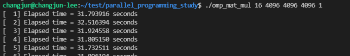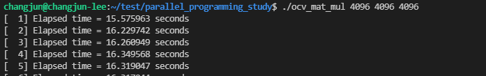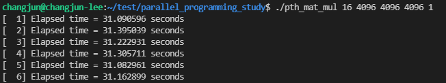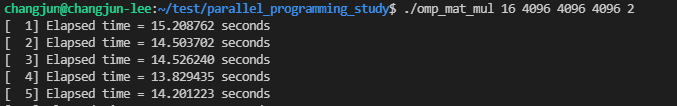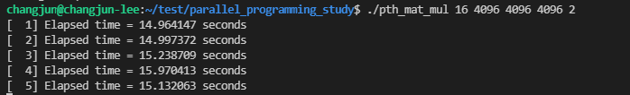 16개의 스레드와 4096x4096 행렬 A, B의 곱을 1번 방법으로 실행한 결과는 다음과 같습니다.
