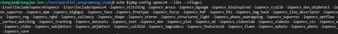 사용하는 OpenCV 버전에 따라서 컴파일 커맨드가 조금 달라질 수는 있겠지만, 저의 경우에는 OpenCV 4.2.0을 사용하고 있고 아래의 커맨드로 컴파일을 수행하였습니다. 'pkg-config opencv4 --libs --cflags'는 opencv 라이브러리를 사용하고 링크하기 위한 플래그로 대체됩니다.