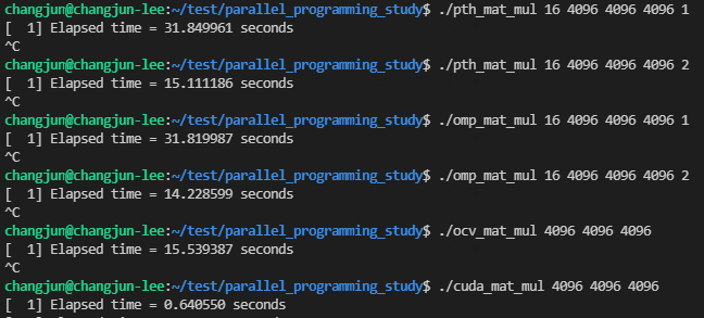 WSL2 - ubuntu 20.04 환경에서 실행했으며, 사용한 라이브러리는 4 종류(Pthreads, OpenMP, OpenCV, CUDA)를 사용하여 행렬 곱 연산을 구현해보았습니다. 행렬 곱셈을 위해서 캐논 알고리즘과 같은 특별한 알고리즘은 사용하지 않습니다.