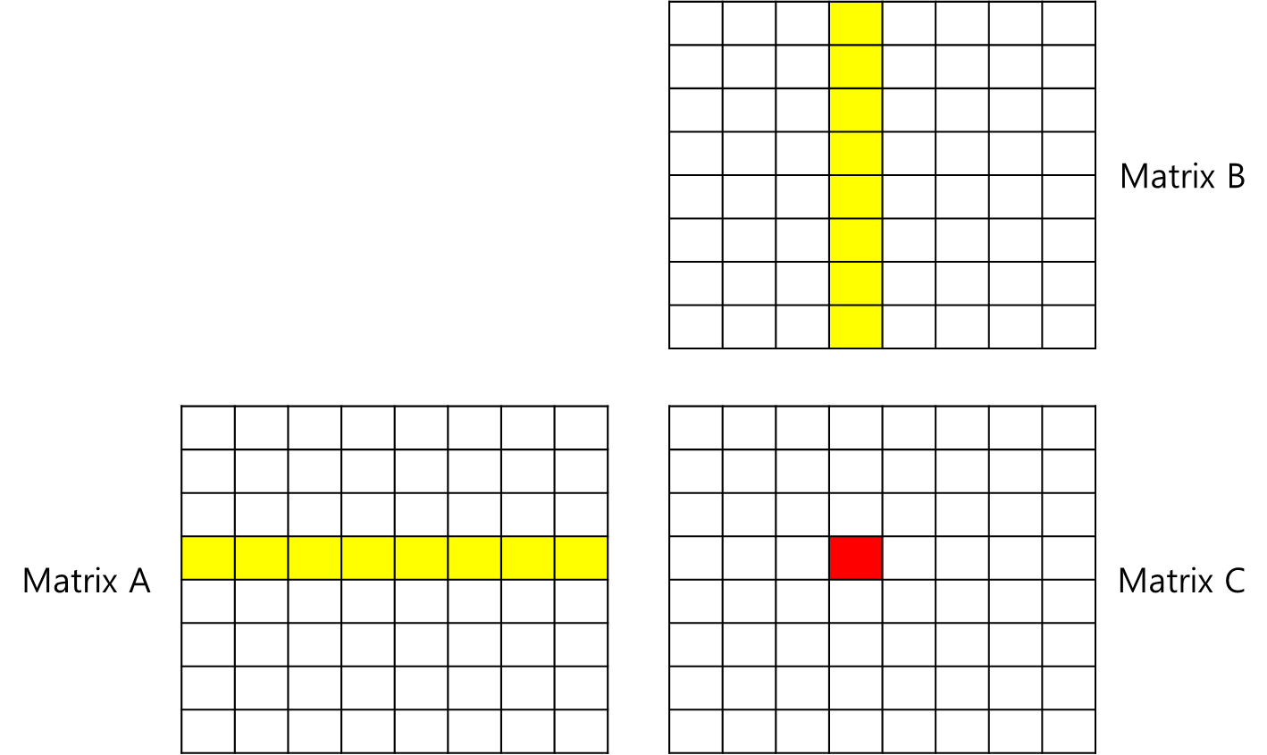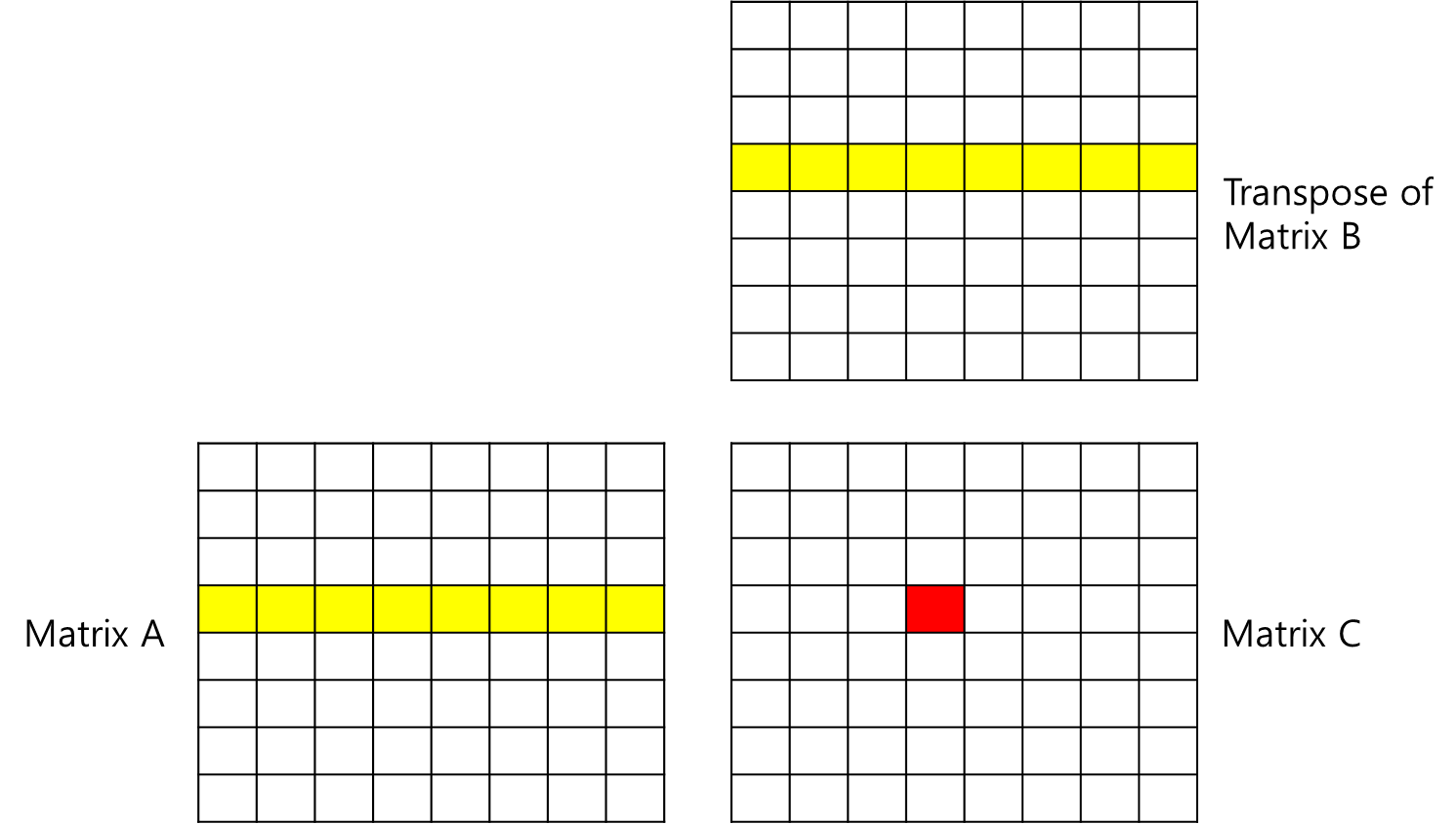 위 그림처럼 (4, 4) 위치의 값을 구하기 위해서는 행렬 A의 4행의 요소들과 행렬 B의 4열의 요소들을 곱해야하는데, 행렬 B의 4열 요소들에 접근할 때마다 캐시미스가 발생하게 됩니다.