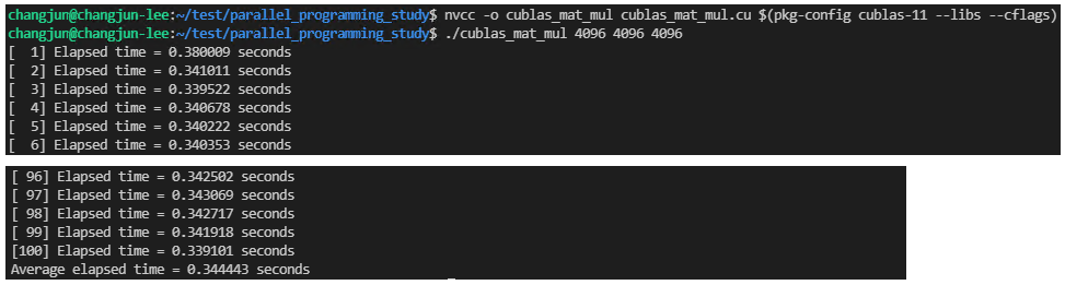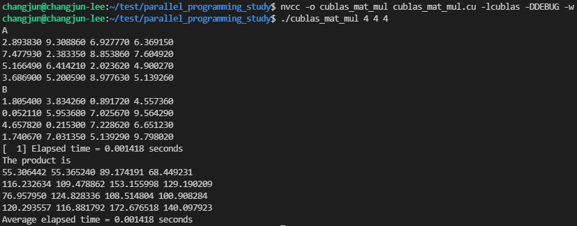 $ nvcc -o cublas_mat_mul cublas_mat_mul.cu -lcublas
