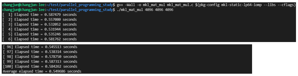 $ gcc -Wall -o mkl_mat_mul mkl_mat_mul.c $(pkg-config mkl-static-lp64-iomp --libs --cflags)