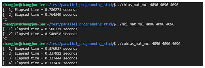 이전 게시글에서 여러 병렬 프로그래밍을 위한 라이브러리를 사용하여 행렬 곱 연산을 구현하고, 연산에 걸리는 시간을 측정해봤습니다. 그리고, 추가적으로 다른 선형대수를 위한 수학 라이브러리에서는 행렬 곱 연산 성능이 어떤지 궁금하여 OpenBLAS, mkl, cuBLAS에서 제공되는 행렬 곱 연산의 수행 시간을 측정해보았습니다.