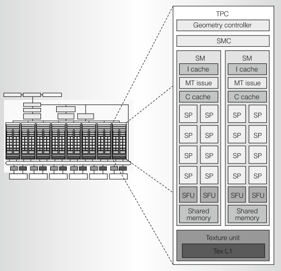 각 SM은 여러 개의 스트리밍 프로세서(Streaming Processors: SPs)를 가지고 있고, SPs는 control logic과 instruction cache를 공유합니다. 아래 이미지는 위 이미지를 조금 더 자세히 나타낸 것입니다. (Tesla Architecture)
