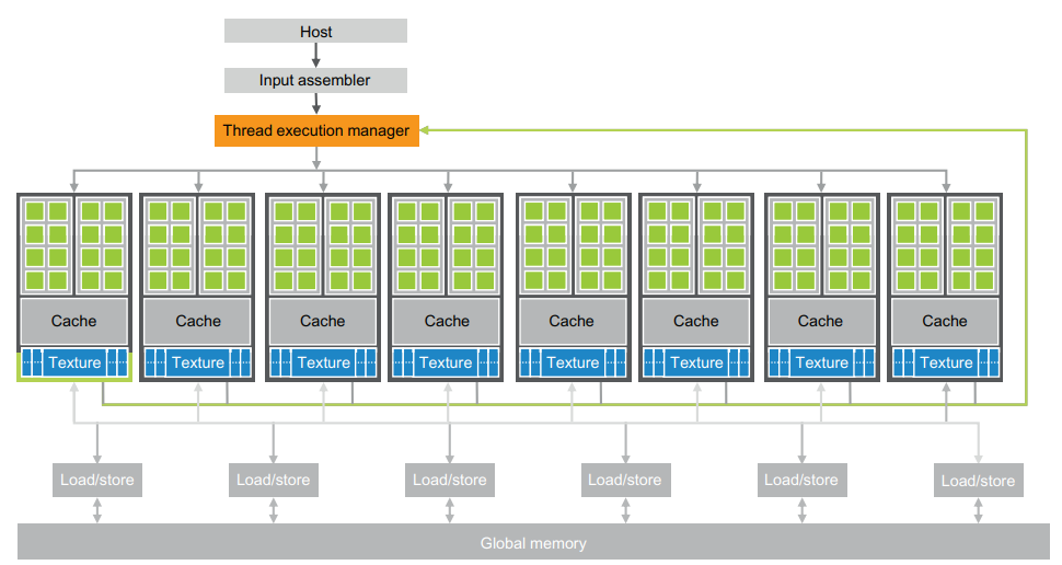 GPU를 사용한 소프트웨어는 아마 많은 수의 병렬 스레드를 사용하여 작성될 것입니다. 하드웨어 측면에서는 많은 스레드를 사용하여 지연시간이 긴 메모리 접근이나 산술 연산을 빠르게 수행할 수 있습니다. 또한, 어플리케이션의 대역폭 요구사항을 제어하는데 소형 캐시 메모리가 제공되므로 동일한 메모리 데이터에 액세스하는 스레드들이 DRAM에 직접 액세스할 필요도 없습니다.