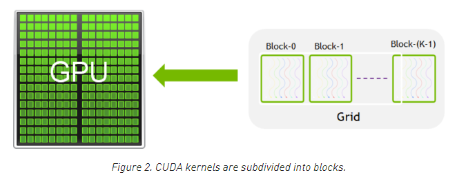 아래 이미지는 GPU에서 실행되는 함수인 CUDA 커널을 보여주고 있습니다. 프로그램에서 병렬로 실행될 수 있는 부분은 K개의 서로 다른 CUDA 스레드에 의해서 병렬로 K번 실행됩니다.