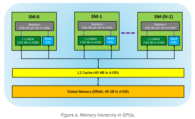 - Read-only memory - 각 SM은 하나의 instruction cache, constant memory, texture memory, R0 cache를 가지고 있으며, 커널 코드에서 읽기 전용으로 사용합니다.