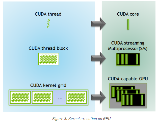 각 CUDA 블록은 하나의 streaming multiprocessor(SM)에 할당되어 실행되며, GPU의 다른 SMs로 이동할 수 없습니다 (선점, 디버깅, 또는 CUDA 동적 병렬화 중에는 예외입니다.). 하나의 SM은 CUDA 블록에 필요한 리소스에 따라서 여러 개의 블록을 동시에 실행할 수 있습니다. 각 커널은 하나의 device에서 수행되고 CUDA는 여러 커널들이 하나의 device에서 동시에 실행할 수 있도록 지원합니다. 아래 Figure 3은 GPU에서 사용할 수 있는 하드웨어 리소스에 대한 커널 스레드 계층과의 매핑을 보여줍니다.