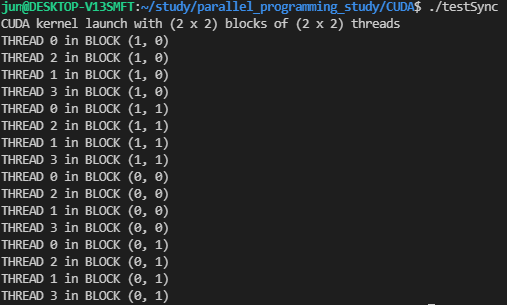 그리고, main 함수에서는 각 블록이 2x2 스레드를 갖고, 총 2x2 블록의 그리드를 생성하여 커널을 수행하도록 했습니다. 이 코드를 컴파일 후 실행하면 어떻게 될까요?