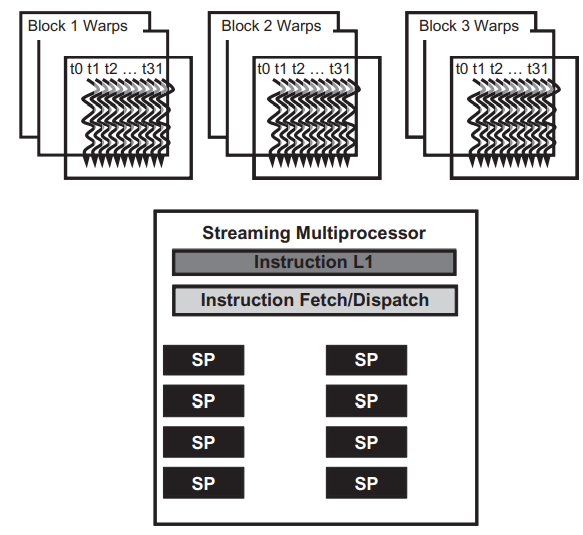 위 이미지는 실제로 명령을 실행하는 여러 Streaming Processors(SPs)를 보여주고 있습니다. NVIDIA에서는 이 SP를 CUDA Core라고 부릅니다. 일반적으로 각 SM에 할당된 수보다 SP의 수가 훨씬 적습니다. 따라서, 각 SM은 어느 시점에서든 SM에 할당된 모든 스레드의 부분 집합(일부)만 동시에 실행할 수 있는 정도의 하드웨어만 가지고 있습니다. 초기 GPU 설계에서는 각 SM은 주어진 순간에 하나의 워프에 대해 하나의 명령어만 실행할 수 있었는데, 최근에는 각 SM은 언제든지 적은 수의 워프에 대해 명령을 수행할 수 있습니다. 이는 어떤 하드웨어든지 SM에 있는 모든 워프의 들의 하위 집합에 명령을 실행할 수 있다는 것을 의미합니다.