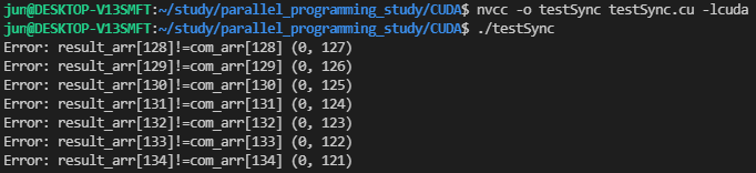 실행해보면, 위와 같은 결과를 확인하실 수 있습니다. reverse 커널 내에서 공유 메모리인 임시 배열에 값을 넣어주는 작업이 각 스레드에서 수행되고, 마지막에 원본 배열의 값에 뒤집어진 값을 넣어줍니다. 즉 아래 코드에서 line 9에서 원래 배열 arr에 temp 배열의 값을 넣어주기 위해서는 이 구문이 수행되기 전에 temp 배열은 arr 배열의 값을 모두 담고 있어야합니다. 하지만, 스레드마다 미세하게 수행 시점이 다르기 때문에 temp에 배열 값이 저장되지 않았는데, line 9에서 저장되지 않은 temp값을 참조하여 원본 배열에 값을 써주면서 위와 같은 에러가 발생하는 것입니다.