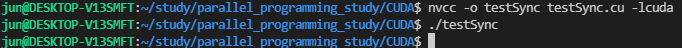 커널이 정상적으로 출력하기 위해서 우리는 host 코드에서 호출된 커널이 모두 완료되기 전까지 return에 도달하지 못하도록 대기시켜야 합니다. CUDA 런타임 API에서는 host code에서 device와 동기화를 시켜주기 위한 cudaDeviceSynchronize()를 제공합니다. main 함수를 아래와 같이 수정하고 다시 컴파일 후 실행해보겠습니다.
