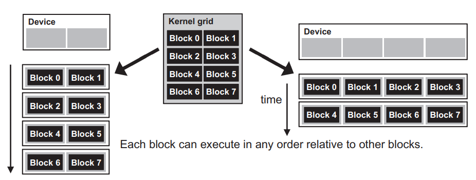 이는 CUDA 배리어 동기화의 설계에 있어서 중요한 tradeoff를 보여줍니다. 서로 다른 블록의 스레드 사이에는 서로 배리어 동기화를 하지 않도록 하면 그 스레드들은 서로를 기다리지 않으므로 CUDA 런타임 시스템은 블록을 임의의 순서대로 실행할 수 있습니다. 이러한 유연함(flexibility)은 아래 이미지처럼 확장 가능한 구현을 가능하게 합니다.