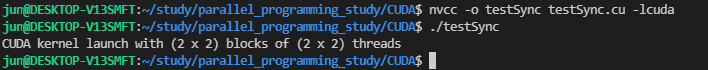 이제 커널이 시작된 후에 host code에서는 cudaDeviceSynchronize가 호출된 위치에서 대기하다가 각 스레드의 커널 함수가 모두 수행된 후에 프로그램을 종료합니다. 정확하게는 함수 호출 이전에 시작된 모든 연산이 종료될 때까지 host code를 대기시킵니다.