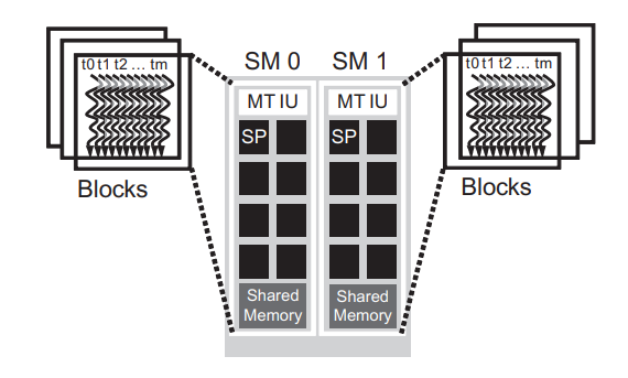 커널이 실행되면, CUDA 런타임 시스템은 해당되는 스레드들의 그리드를 생성합니다. 위에서 언급했듯이, 이 스레드들은 블록 단위로 실행 리소스에 할당됩니다. GPU 하드웨어는 Streaming Multiprocessors(SMs)로 구성됩니다. 아래 이미지는 각 SM에 할당되는 다중 스레드 블록을 보여주고 있습니다.