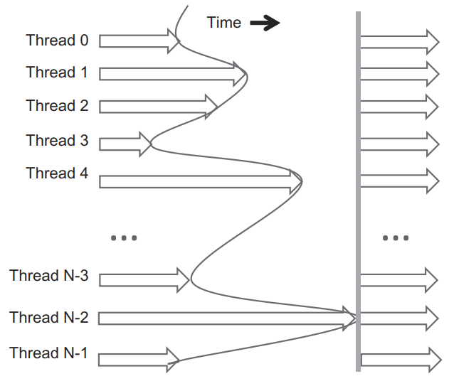 블록에 N개의 스레드가 있고, 시간은 왼쪽에서 오른쪽으로 흐르고 있습니다. 몇몇의 스레드는 배리어 동기화 구문에 일찍 도착하고 몇몇은 훨씬 더 늦게 도착합니다. 배리어에 일찍 도착한 스레드들은 늦게 도착하는 스레드들을 기다리게 됩니다. 그리고, 마지막 스레드가 배리어에 도달하면, 모든 스레드들이 이제 다음 작업을 시작하게 됩니다.