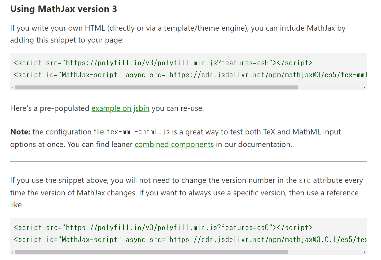 두 종류의 적용 코드가 있는데, 위의 스크립트 코드는 자동으로 MathJax 버전을 최신으로 맞춰주는 코드고, 밑의 스크립트 코드는 특정한 버전을 적용하기 위한 스크립트 코드입니다. 저는 위의 스크립트 코드를 사용했습니다.