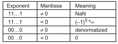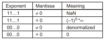 위 표에서 모든 비트가 1인 excess representation 패턴은 reserved 패턴입니다. IEEE 표준이 이 특별한 비트 패턴을 특별한 방법으로 사용하는데 뒤에서 다시 알아보겠습니다.