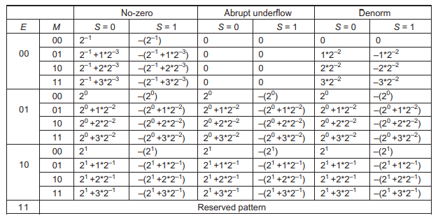 비슷한 방식으로 부동소수점 형식에서 표현 가능한 수를 시각화할 수 있습니다. 아래 표에서 위에서 설명한 부동소수점 표기 형식(no-zero)과 두 개의 변형된 형식에 대해 표현 가능한 모든 수를 보여주고 있습니다. 표의 크기를 고려해서 5비트 형식을 사용했는데, 이 형식은 1비트 S, 2비트 E(excess-2 code), 그리고 2비트 M('1.'이 생략됨)으로 구성됩니다.