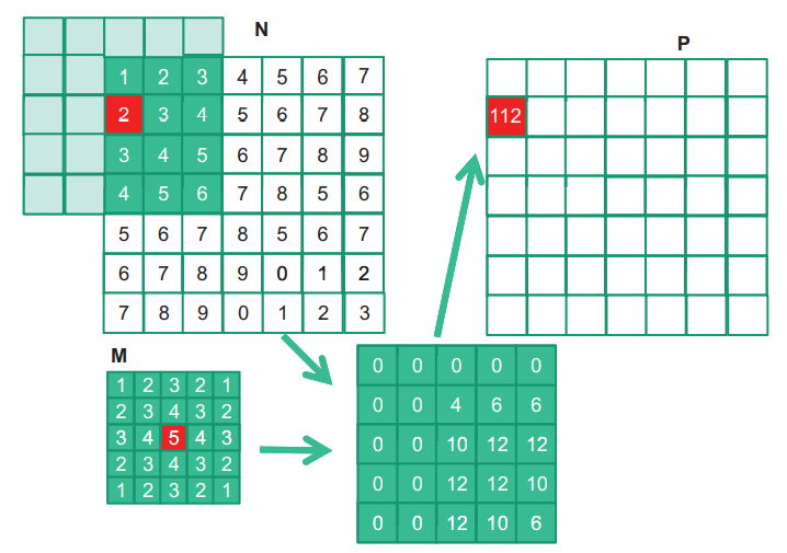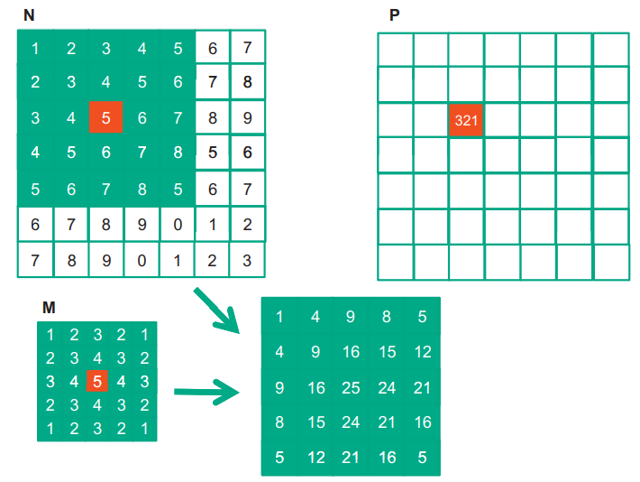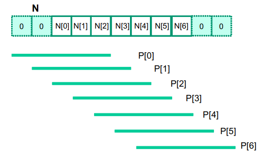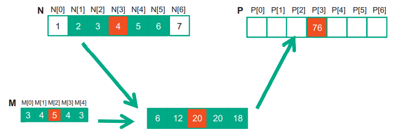 위 그림처럼 P[2]의 값은 N[0]에서 N[4]까지의 가중합으로 계산됩니다. N 원소의 값을 1,2,3,...7 이라고 가정합니다. M 원소는 가중치를 정의하는데, 그 값들이 3,4,5,4,3이라고 가정하겠습니다. 이 가중치들은 각 위치에 해당하는 N 원소 값에 곱하여 더해집니다. 따라서, P[2]에 대한 계산은 다음과 같습니다.
