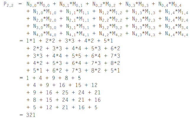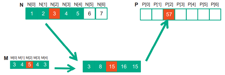 \[\begin{align*} P[2] &= N[0]*M[0] + N[1]*M[1] + N[2]*M[2] + N[3]*M[3] + N[4]*M[4] \\ &= 1*3 + 2*4 + 3*5 + 4*4 + 5*3 \\ &= 57 \end{align*}\]