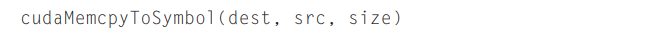 일반적으로 cudaMemcpyToSymbol 함수는 다음과 같이 사용됩니다. dest는 상수 메모리의 위치에 대한 포인터이고, src는 Host 메모리에 있는 데이터에 대한 포인터, size는 복사할 바이트의 수 입니다.