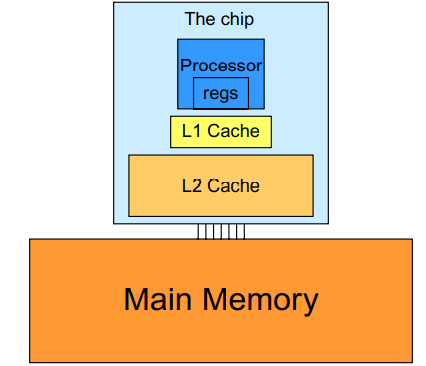 메모리 사이즈와 속도 사이에는 tradeoff가 있습니다. 이로 인해 현대 프로세서는 여러 레벨의 캐시를 사용하는데, 캐시 레벨은 프로세서까지의 거리를 반영합니다. 가장 낮은 수준인 Level 1, L1 캐시는 프로세서 코어에 직접 연결된 캐시입니다. latency나 대역폭이 프로세서에 가까운 속도로 수행됩니다. 그러나 L1 캐시의 크기는 일반적으로 16KB에서 64KB로 작습니다. L2 캐시는 128KB에서 1MB의 범위를 가지지만, 액세스하는데 수십 사이클의 클럭이 걸릴 수 있습니다.