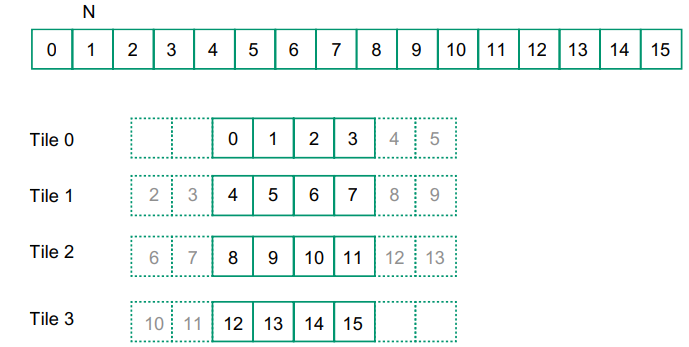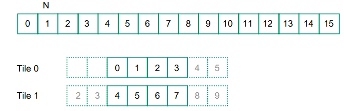 블록의 halo cells은 이웃한 블록의 내부 cells입니다. 예를 들어, 아래 그림의 타일 1의 halo cell N[2]와 N[3]은 타일 0의 내부 원소입니다. 블록 1에서 이러한 halo cell을 사용해야할 때, 블록 0에 의한 액세스로 인해 이미 N[2]와 N[3]가 L2 캐시에 있을 가능성이 높습니다.