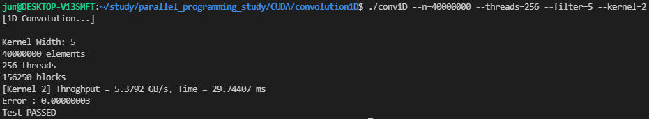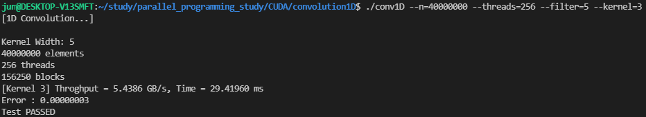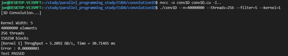 다음은 타일링을 적용한 1D 컨볼루션 실행 결과입니다.