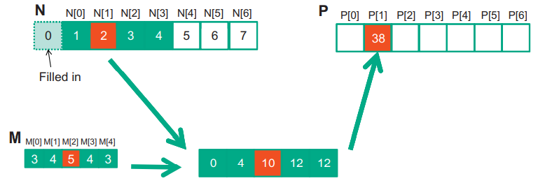 P[i]에 대한 계산은 N[i-2]부터 시작하는 부분배열과 M배열 사이의 Inner Product(내적)으로 볼 수 있습니다.