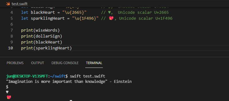 let sparklingHeart = "\u{1F496}" // 💖, Unicode scalar U+1F496