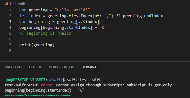 만약 substring에서 인덱스로 접근하여 문자값을 변경하려고 하면, 아래처럼 에러가 발생합니다. Substring에서 subscript는 only-get에만 사용될 수 있습니다.