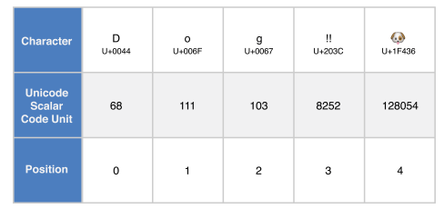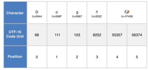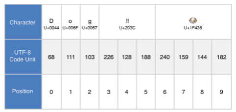 위 예제 코드에서 문자 D, o, g의 UTF-8 변환 값은 아스키와 같습니다. 다음 3개의 10진수 codeUnit 값 (226, 128, 188)은 DOUBLE EXCLAMATION MARK 문자를 표현합니다. 마지막 4개의 codeUnit 값 (240, 159, 144, 182)는 DOG FACE 문자를 표현합니다.