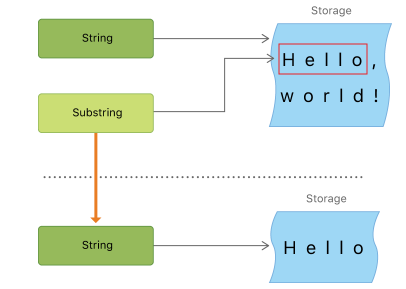 단시간이 아닌 오랜시간 사용되는 substring을 String 인스턴스로 변환하여 사용되어야 하는 이유는 메모리 관리 때문입니다. 위 예제 코드에서 greeting은 문자열 타입이고, 구성하는 문자들을 저장하는 메모리 공간이 있습니다. beginning은 greeting의 substring이며, begging은 greeting이 사용하는 메모리를 재사용합니다. 반면, newString은 substring으로부터 생성된 새로운 문자열이고, 자체 메모리 공간을 가지게 됩니다.
