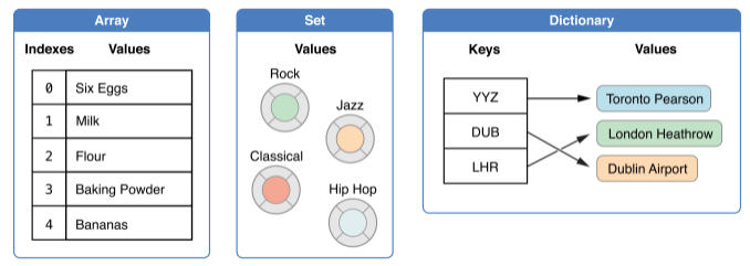 Swift는 Arrays(배열), Sets(집합), Dictionaries(딕셔너리), 3가지의 주요 콜렉션 타입을 지원합니다. 배열은 순서가 있는 값들의 콜렉션이고, Set은 유니크한 값들의 순서없는 콜렉션이며, 딕셔너리는 key-value 관계의 값들의 순서가 없는 콜렉션입니다.