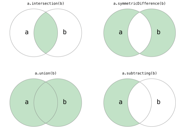 - isStrictSubset(:), isStrictSuperset(:) 메소드를 통해 집합이 지정된 집합과 같지 않지만 subset인지 superset인지 확인합니다.