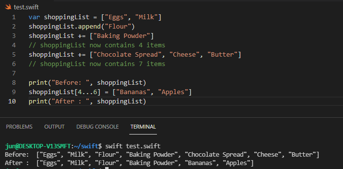 위 예제 코드에서 배열 문자열은 두 개의 String 타입의 값을 포함합니다. 이는 shoppingList 변수의 선언 타입과 일치하므로 이 두 개의 문자열 값을 초기 항목으로 초기화됩니다.