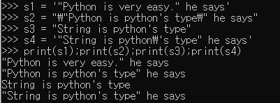 s4 = '"String is python\'s type" he says' #\'를 사용하기