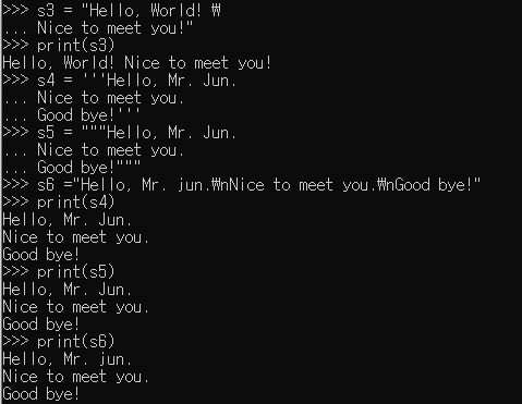 또한 여러 문장을 나타내기 위해서 ''' 이나 """ 을 사용할 수도 있습니다. s4와 s5는 s6과 같습니다.