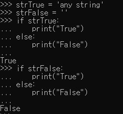 위 예시처럼, strTrue에는 값을 넣었고 strFalse에는 어떠한 값도 넣지 않았습니다. 결과는 값이 존재하는 문자열은 True, 값이 존재하지 않는 문자열은 False로 판단됩니다. 이는 후에 배울 리스트, 튜플(tuple), 딕셔너리(Dictionary)에도 동일하게 적용됩니다. 해당 자료형이 비어있으면 False, 비어있지 않으면 True인 거죠.