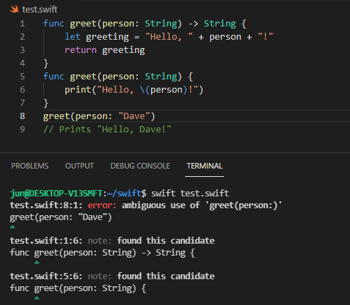 그리고 위에서 리턴값이 존재하는 greet(person:) 함수와 이 함수는 서로 구분되지 않습니다.
