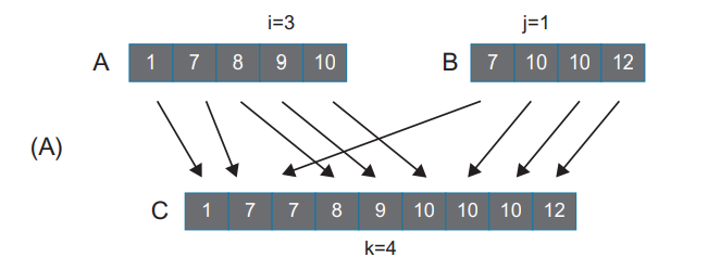 각각 m, n개로 이루어진 입력 배열 A, B가 있고, 두 배열은 이미 정렬이 되어 있다고 가정하겠습니다. 각 배열의 인덱스는 0부터 시작합니다. 그리고 A와 B를 병합하여 생성되는 정렬된 출력 배열이 C라고 한다면 C는 m+n개의 요소들로 구성될 것 입니다.