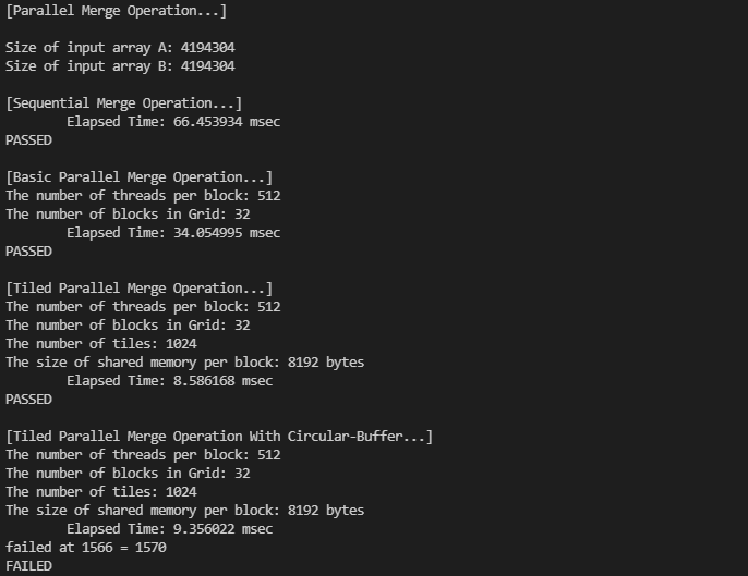 다만, tile의 크기를 8192까지 증가시켜주면, 병합 연산이 정상적으로 수행되는 것을 확인했습니다. tiled merge kernel과 circular-buffer merge kernel의 수행 시간은 큰 차이가 없었습니다.