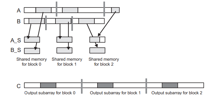 간단한 예시로 33,000개의 요소(m=33,000)로 구성된 배열 A와 31,000개의 요소(n=31,000)로 구성된 배열 B를 병합한다고 가정해봅시다. 출력 배열 C 요소의 총 개수는 64,000개가 됩니다. 각 블록에서 16개의 블록(gridDim.x=16)과 128개의 스레드(blockDim.x=128)을 사용한다고 가정하면, 각 블록은 64,000/16 = 4,000개의 출력 배열의 subarray를 생성하게 됩니다. 그리고 tile_size가 1024이기 때문에, 커널의 while 루프는 4000개의 출력 배열 요소를 채우기 위해서 각 블록에서 각각 4번씩 반복될 것입니다.