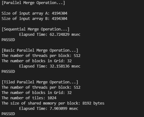 Tiled Merge Operation 커널은 Baisc Merge Operation 커널보다 약 4~5배 빠른 속도로 수행되는 것을 확인할 수 있습니다. 전체 코드는 마찬가지로 아래 링크에서 확인하실 수 있습니다.