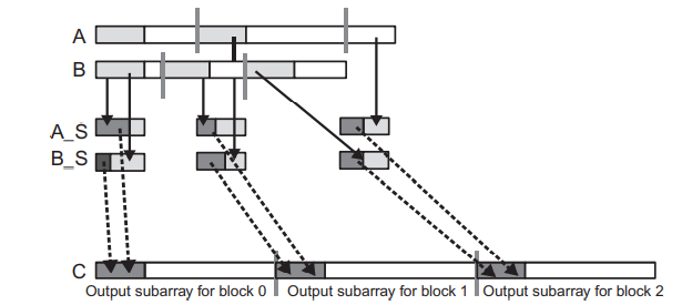 우리의 예제에서 한 번에 반복에서 블록의 모든 스레드들에 의해서 사용되는 A와 B 요소의 총 개수는 1024개가 될 것입니다. 만약 블록 내의 모든 스레드에서 476개의 A 요소가 사용되었다면, B 요소는 1024-476=548개를 사용했음을 알 수 있습니다. 모든 스레드가 1024개의 A 요소만을 사용하는 극단적인 상황(B 요소는 사용하지 않음)이 발생할 수도 있습니다. 총 2048개의 요소가 공유 메모리에 로드되는데, 각 while루프 반복에서 공유 메모리에 로드된 A와 B 요소의 절반만의 블록의 모든 스레드에 의해서 사용됩니다. 그리고 Merge Operation은 sequential merge함수를 호출하여 A와 B 요소의 일부를 사용하여 지정된 범위의 C 요소를 생성합니다.