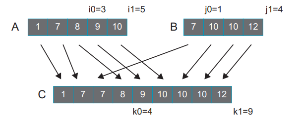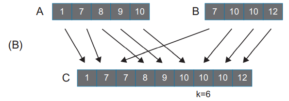 공식을 일반화하면, k개의 요소를 가진 subarray C[0]-C[k-1]은 i개의 요소를 가진 subarrya A[0]-A[i-1]와 (k-i)개의 요소를 가진 subarray B[0]-B[k-i-1]의 merge 결과입니다.
